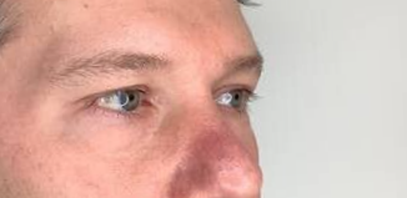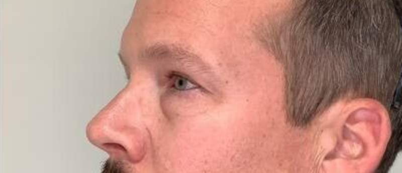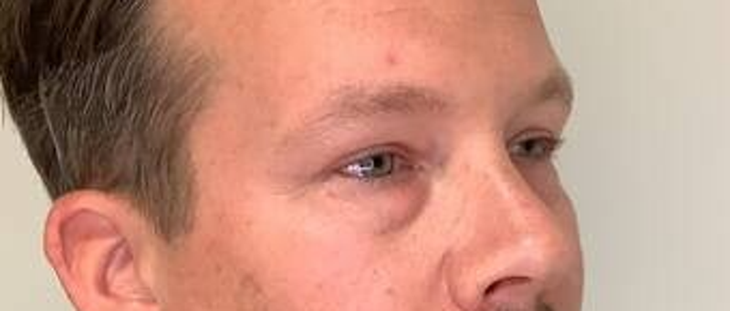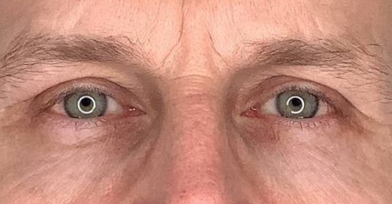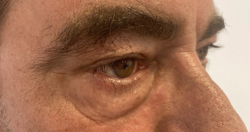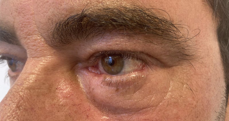 Imágenes 3/4 de este amable paciente. Se ve que la bolsa palpebral está mucho menos perceptible y el paciente luce mas atento.